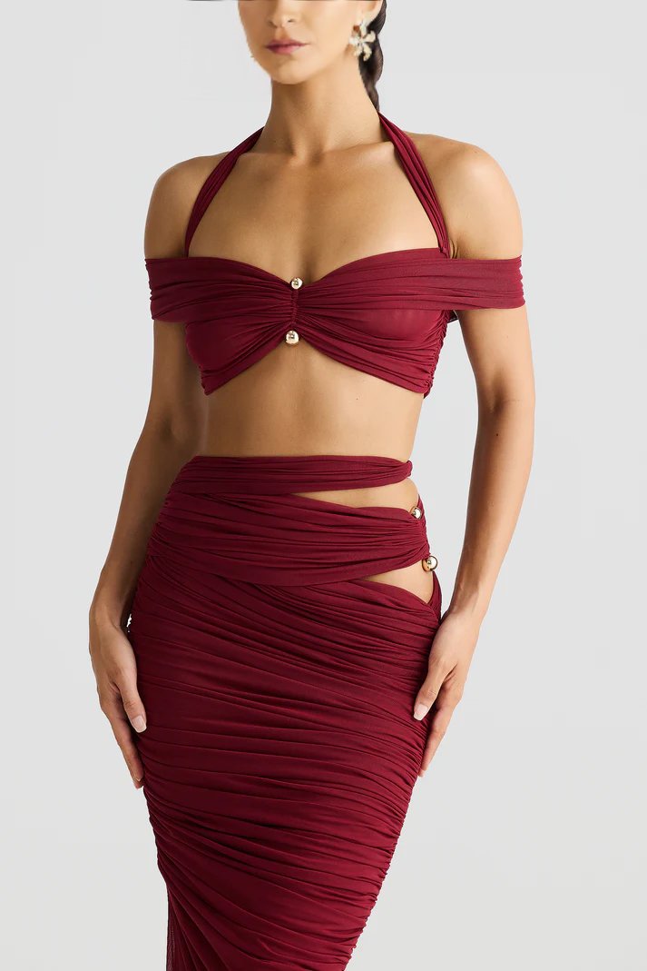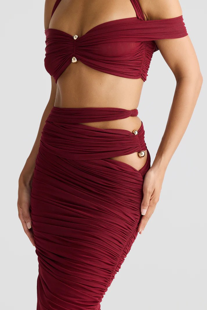 A figure-hugging ankle-length skirt gathered to perfection for a sculpted silhouette. Featuring elegant gold metal accents and sultry side cut-outs, this double-layered beauty flatters effortlessly from every angle.