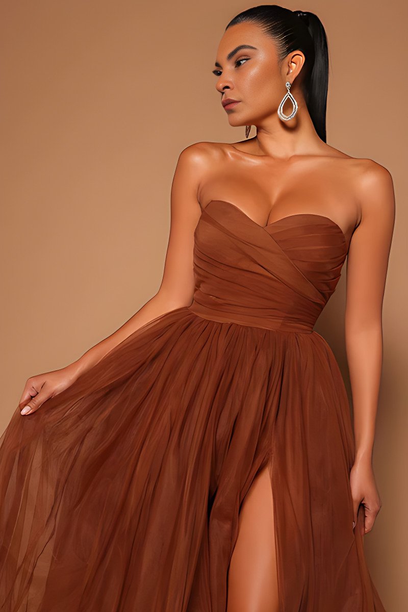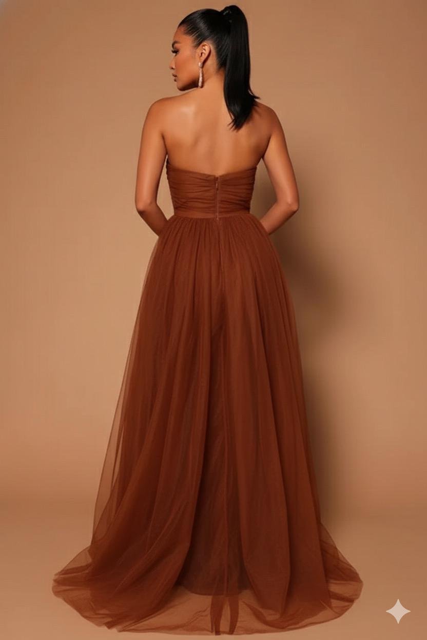 A dreamy gown featuring a sweetheart neckline and a sheer tulle skirt that floats with ethereal grace. The high slit and bodysuit lining add a bold, modern twist, making it a perfect blend of romance and allure.