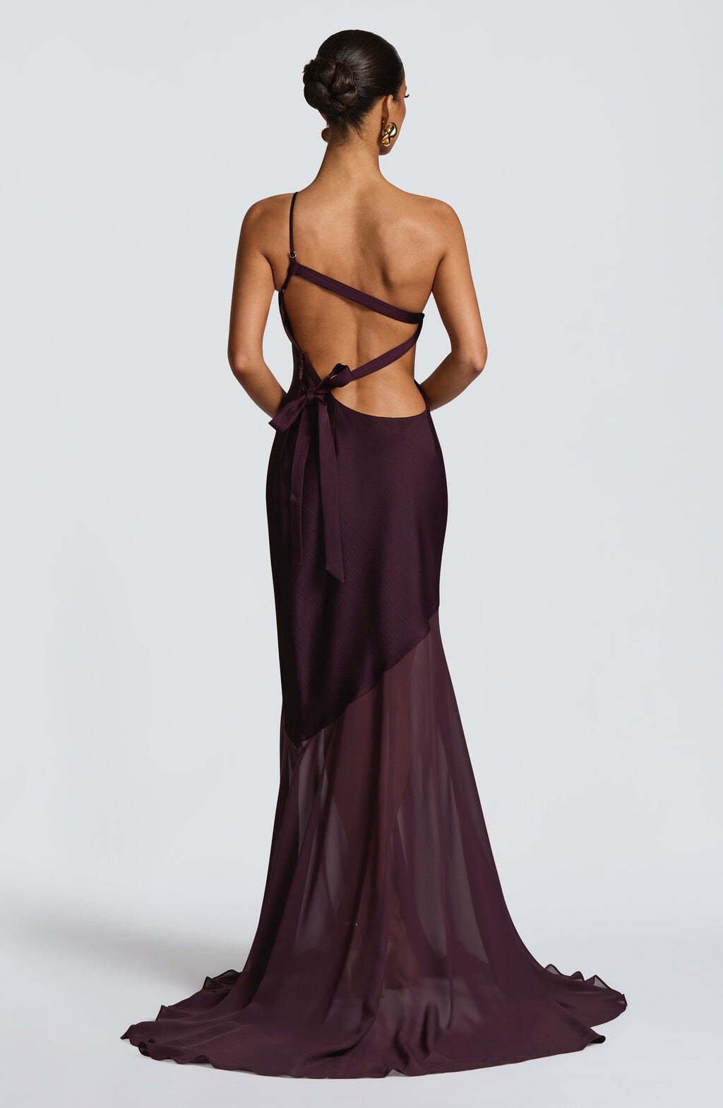 Crafted from textured satin, this gown features a striking one-shoulder neckline and a bias-cut silhouette that skims the body beautifully. The open back with cross straps and adjustable tie adds refined allure, while the semi-sheer fishtail skirt flows into an elegant train for dramatic movement.