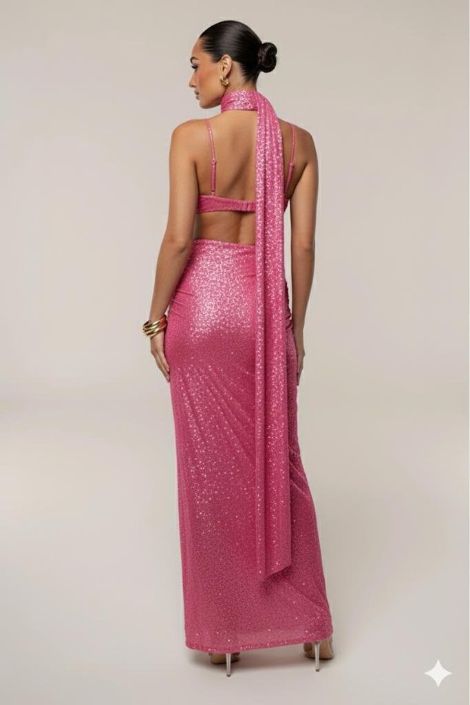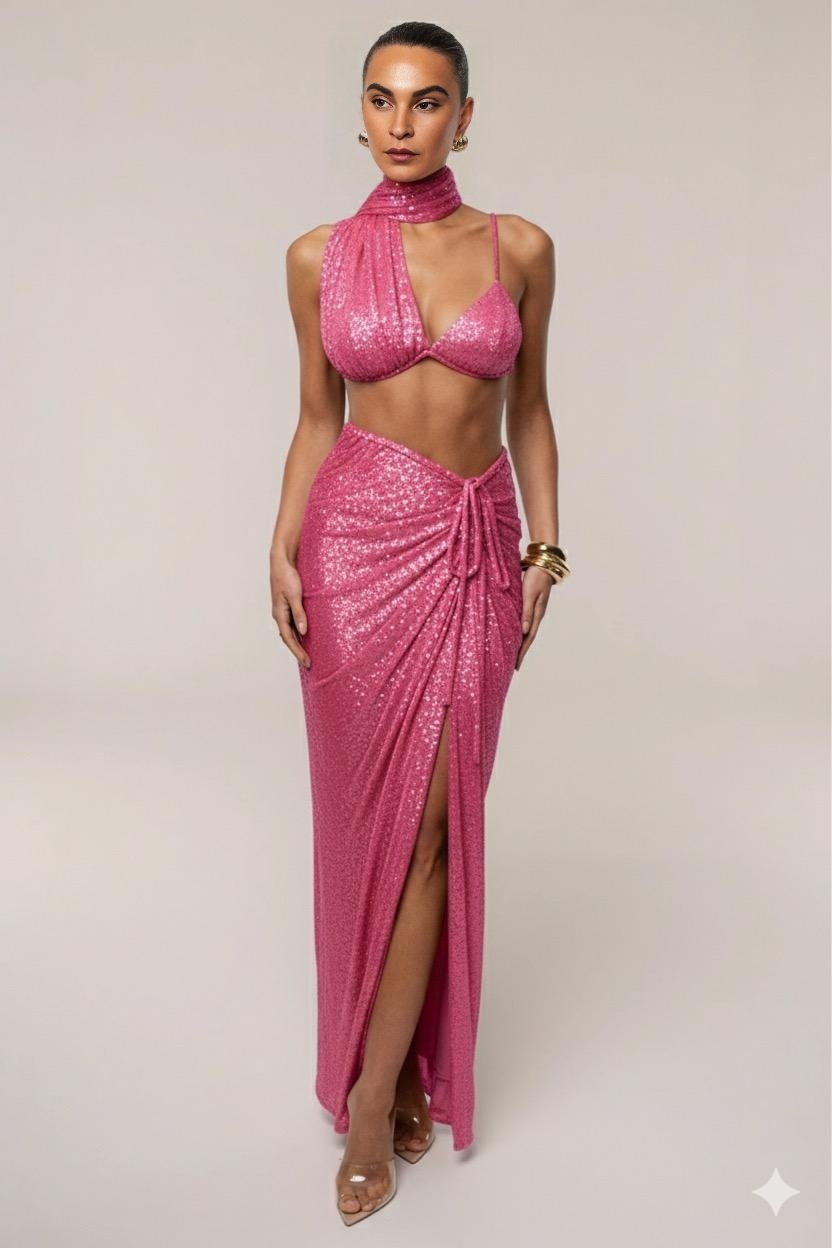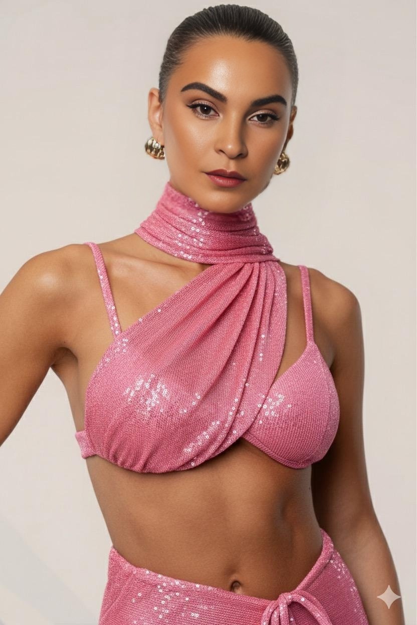 A statement crop crafted from glimmering sequins with an elegant draped neckline. Featuring a sleek halter-style scarf detail and delicate straps, this piece radiates