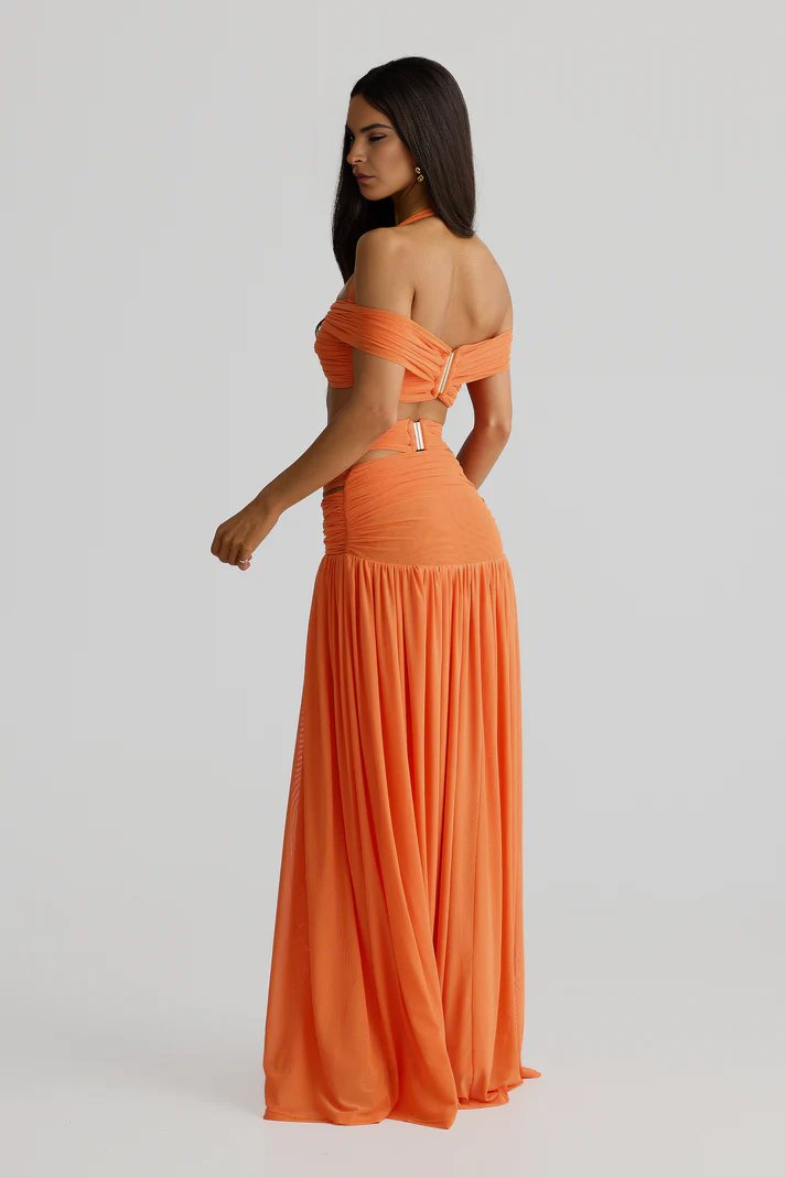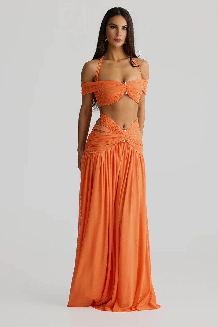 A breezy stretch mesh skirt designed for effortless resort elegance. Featuring a cut-out gathered waistband accented with gold metal detailing, it moves fluidly with every step the ultimate statement piece for sun-soaked escapes.