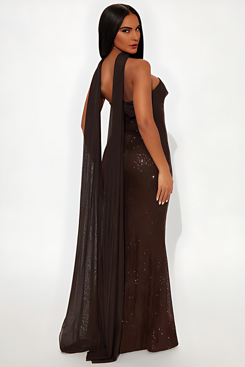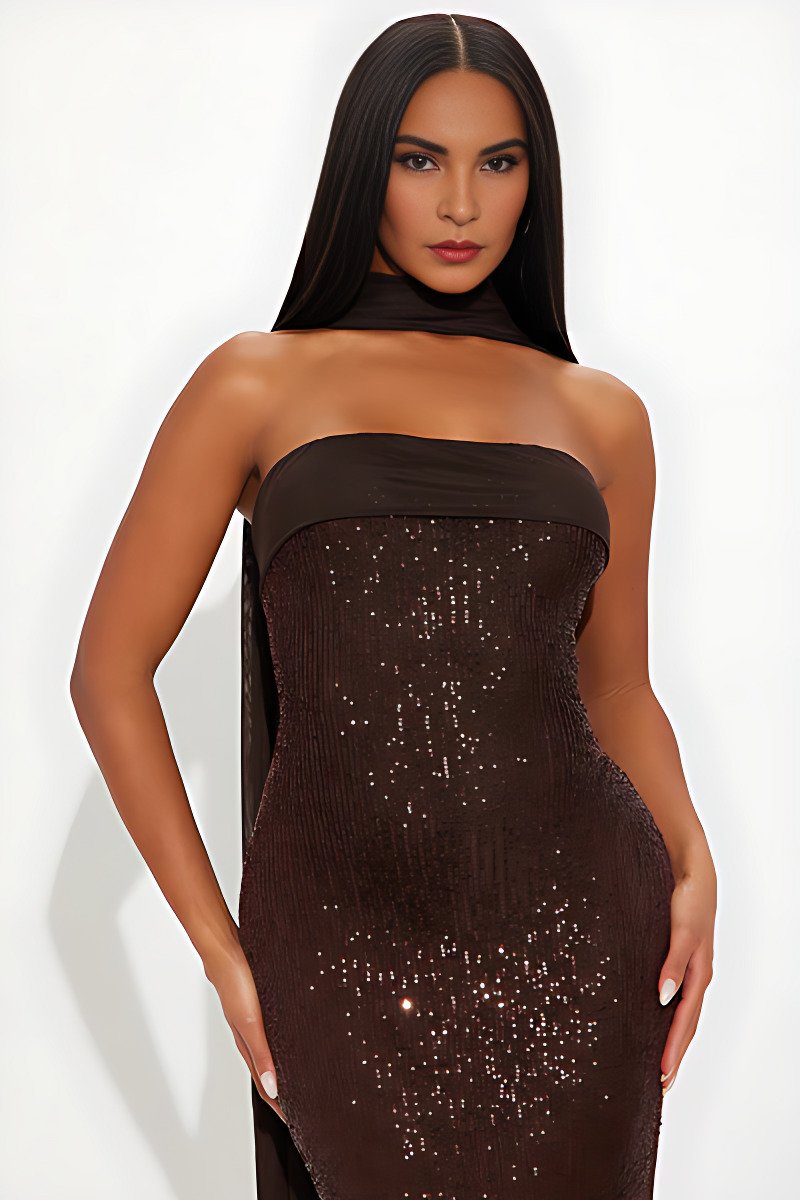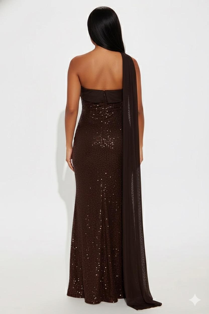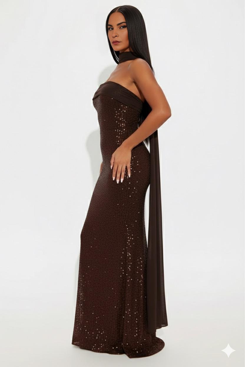 A radiant strapless sequin gown with a sleek straight neckline and elegant mesh scarf detail. The backless design and subtle back slit add refined drama, while the structured fit ensures timeless evening sophistication.