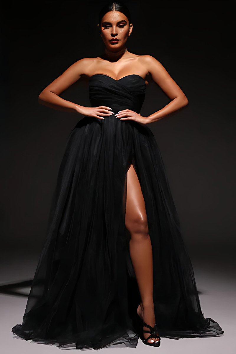 A radiant strapless sequin gown with a sleek straight neckline and elegant mesh scarf detail. The backless design and subtle back slit add refined drama, while the structured fit ensures timeless evening sophistication.