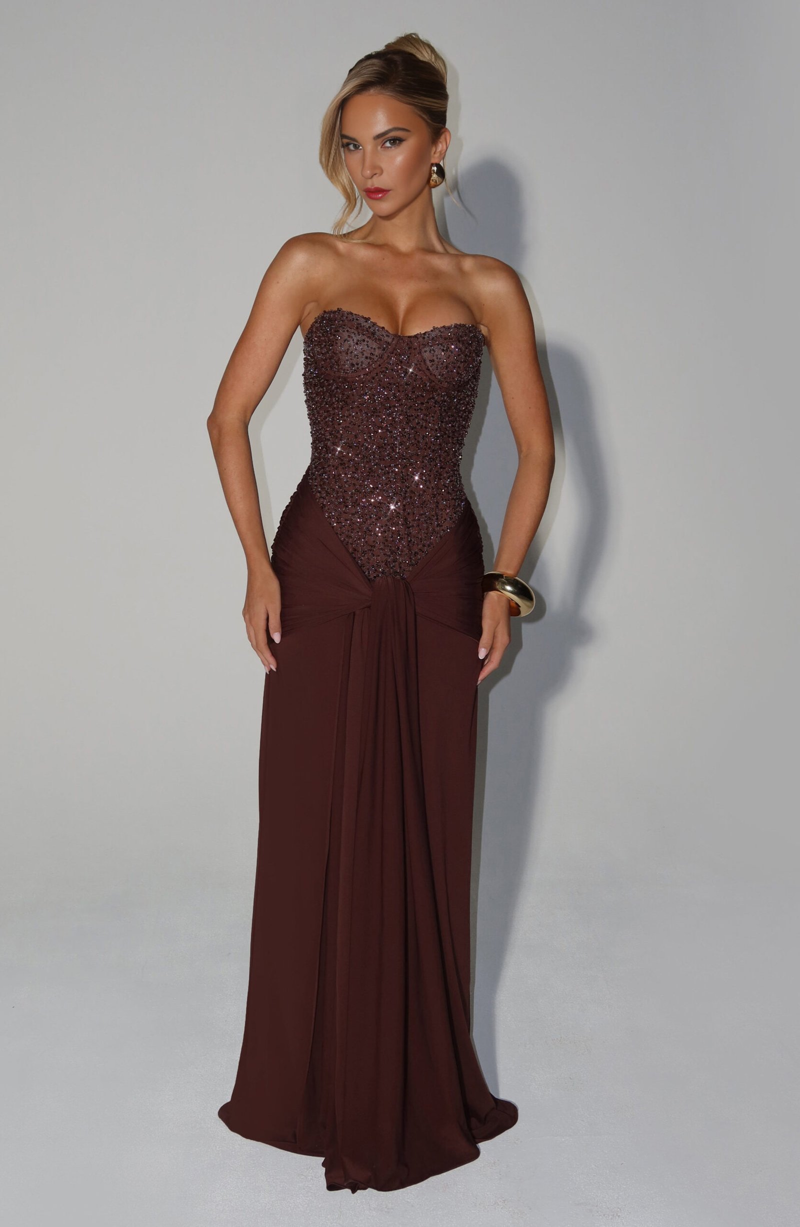 A striking plum-brown maxi dress featuring an embellished mesh bodice with padded, underwired cups for a sculpted fit. The contrast slinky jersey skirt drapes elegantly with gathered front ties, exuding modern glamour and poise.